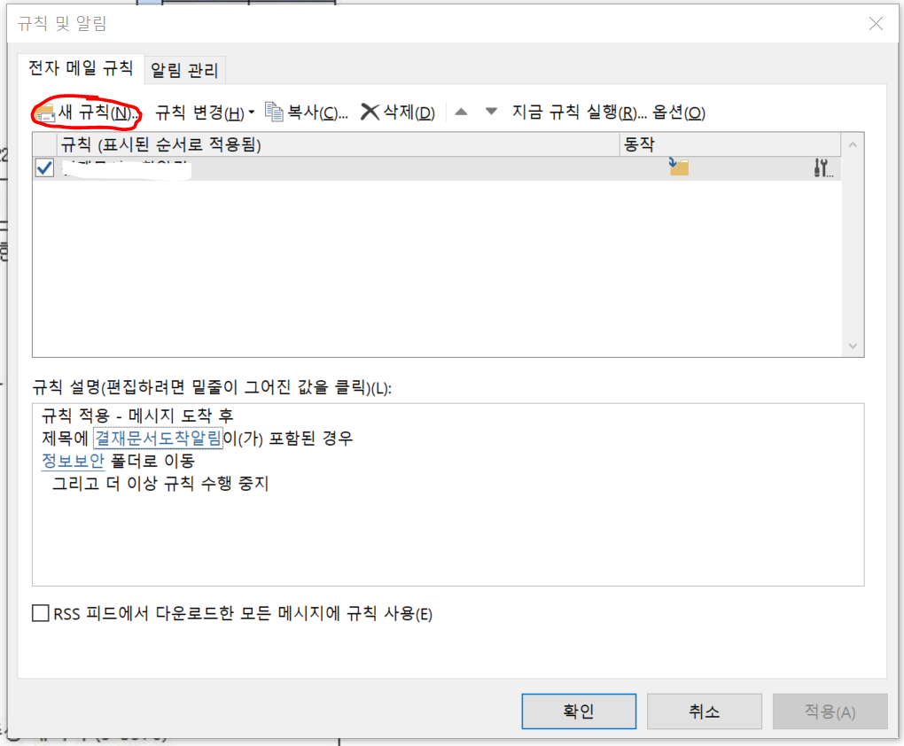 그리고 '새규칙' 을 클릭합니다. 저는 이미 규칙을 하나 만들어 놓았기 때문에 규칙이 있는 것이고 신규로 만드시는 분들은 아무 것도 없을 거에요.