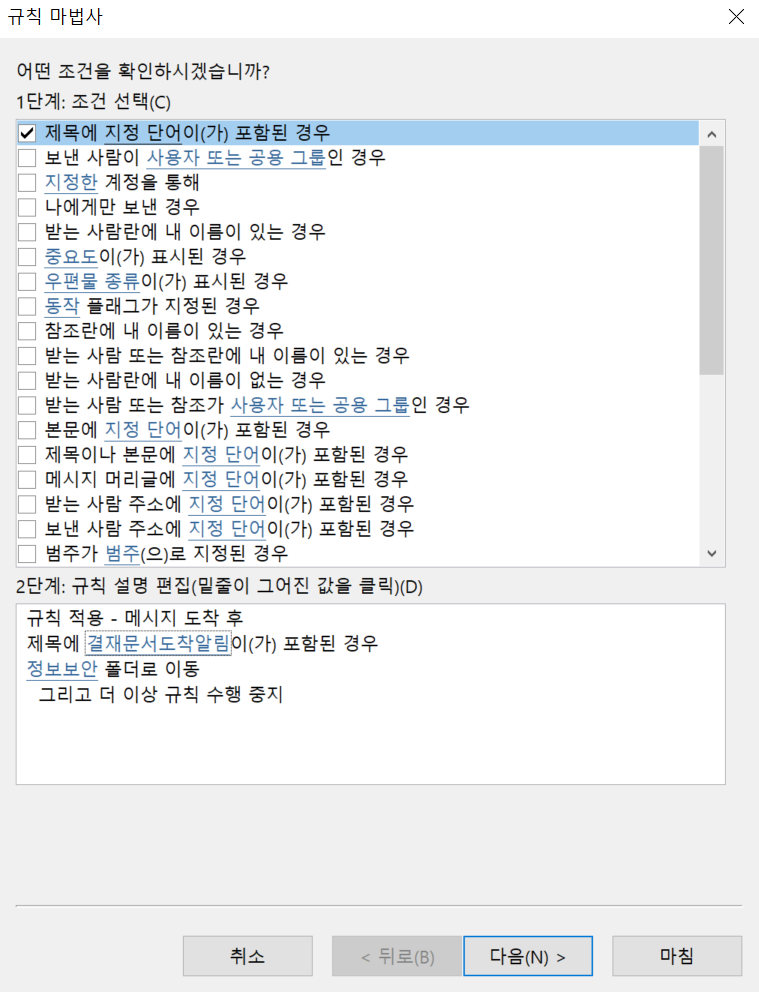 저같은 경우에는 제목에 '결재문서도착알림' 이라는 문구가 들어가면 '정보보안' 폴더로 자동 이동하도록 설정하였습니다.