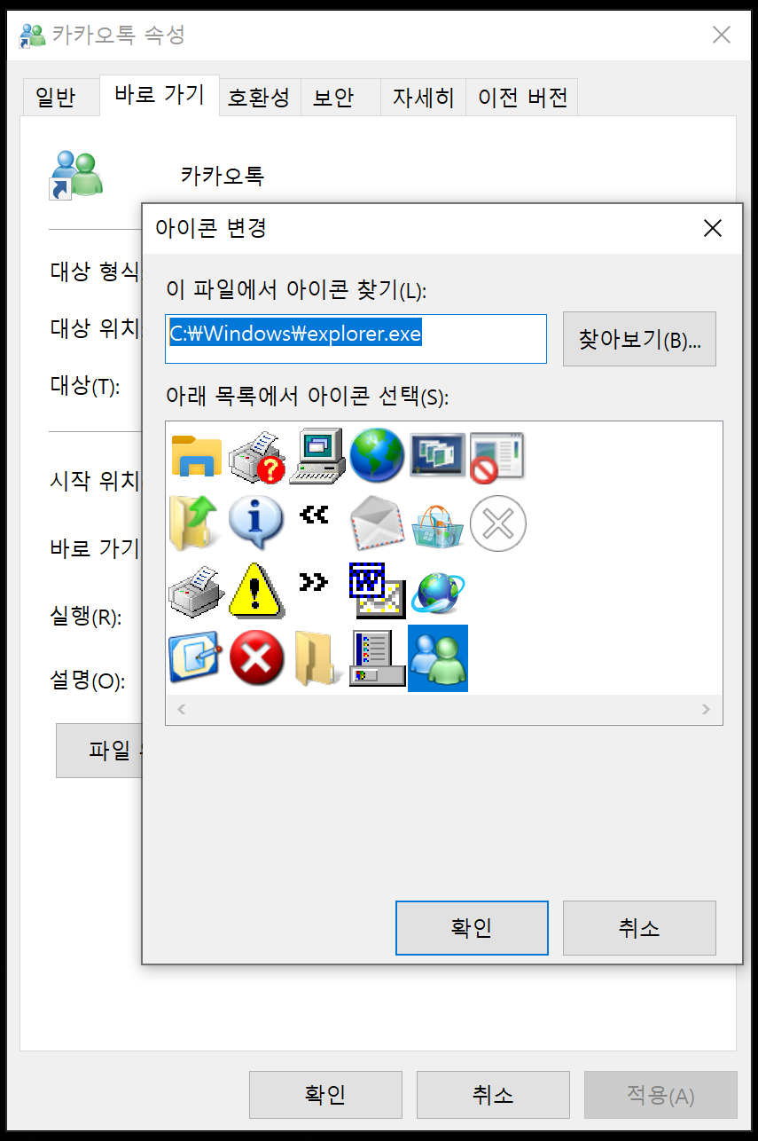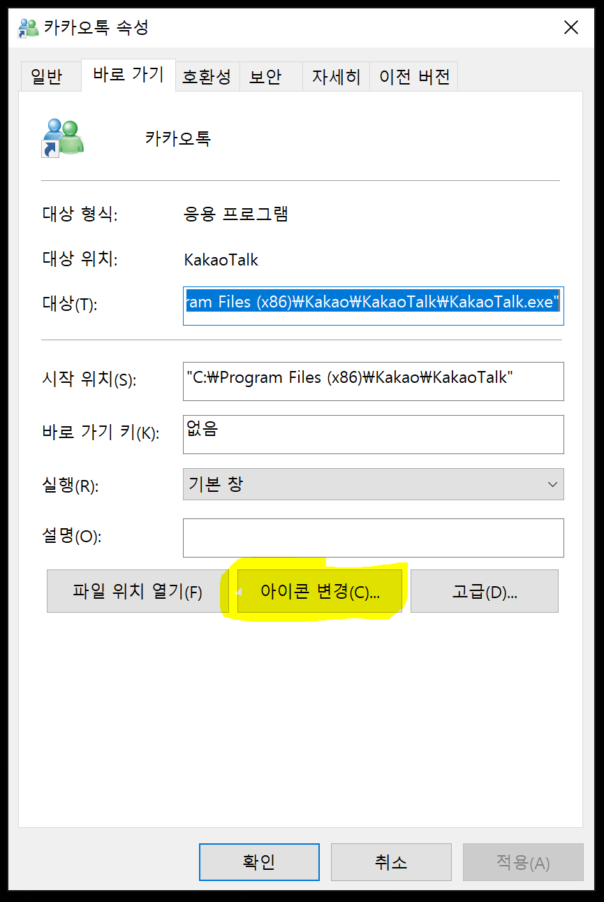'속성'에 들어갔다면, 아래와 같은 화면이 표시될 텐데요, 하단에 '아이콘 변경'을 클릭합니다.